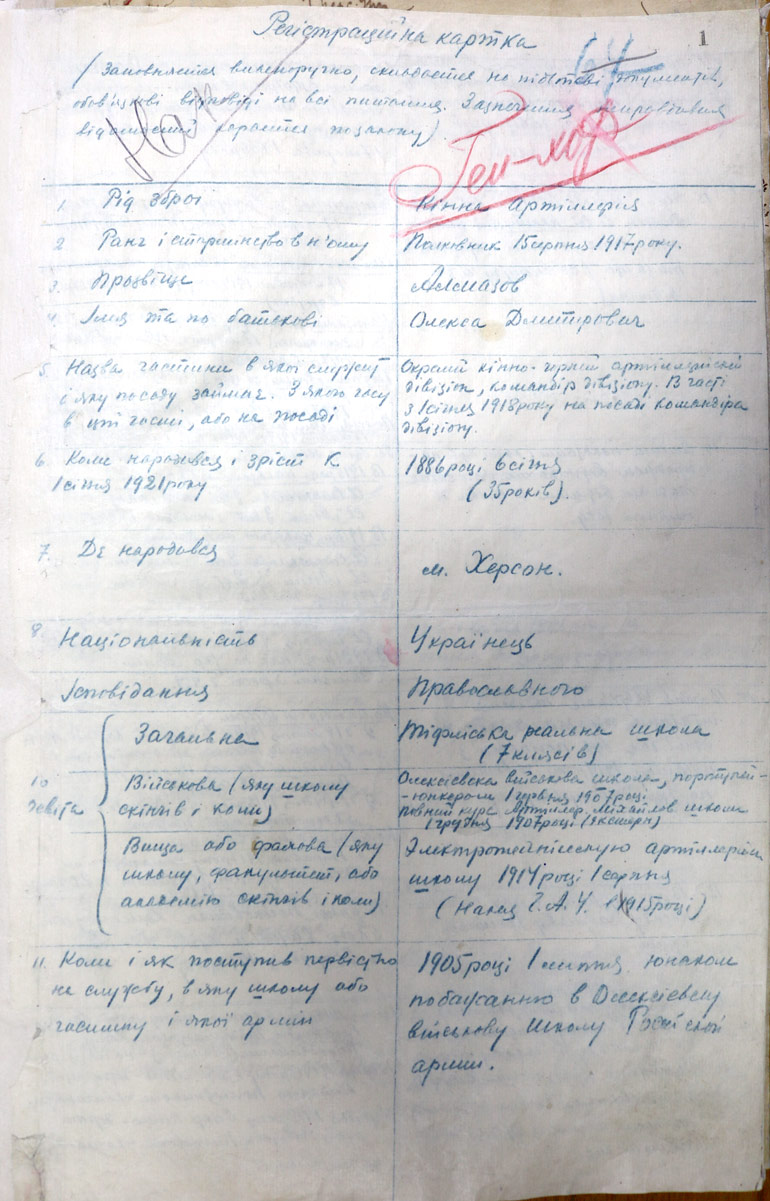 - «Регістраційна картка» Олекси Алмазова, власноруч ним заповнена у лютому 1921 року (з фондів ЦДАВОУ)