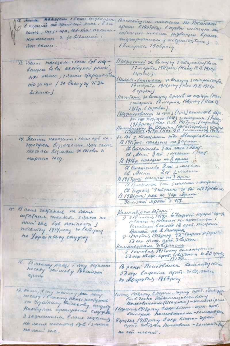 Військове звання, яке зазначив Олекса Дмитрович – полковник зі старшинством з 15 серпня 1917 року, а отже – з часів служби в російській армії. На наступній сторінці документу Алмазов наводить перебіг отримання військових звань, де зазначає, що полковника він отримав 1 листопада 1917 року – за відміни у боях під Кревом у липні-серпні 1917-го, а також – за вислугу років на командних посадах. Про ордени Святого Георгія 4-го ступеня та Святого Володимира 4-го ступеня з мечами та биндою тут теж є. За твердженням Алмазова, він був нагороджений ними (або представлений до нагородження) за ті ж самі бої під Крево у серпні 1917 року.