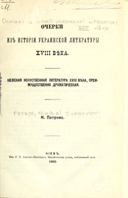 Першою «академічною» історією української літератури на Наддніпрянщині вважаються праці Миколи Петрова — професора Київської духовної академії, зберігача Церковно-археологічного музею при КДА, ініціатора створення Історичного товариства Нестора Літописця в Києві. Ще в 1865 році як студент випускного курсу КДА він опублікував дослідження літературної спадщини могилянців Феофана Прокоповича та Митрофана Довгалевського. Петров був росіянином за походженням (народився в Костромській губернії), приятелем Опанаса Булгакова та хрещеним батьком його сина Михаїла Булгакова — словом, мав усі шанси цілком інтегруватися в російське імперське середовище Києва.