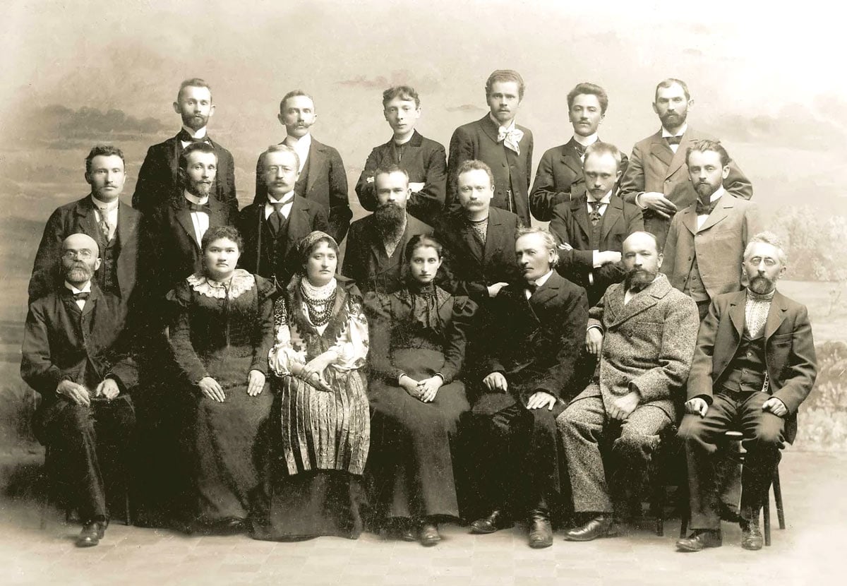Учасники святкування 100-річчя публікації «Енеїди» Івана Котляревського у Львові, 1898 рік. Верхній ряд: Іван Петрушевич, Філарет Колесса, Йосиф Кишакевич, Іван Труш, Денис Лукіянович, Микола Івасюк. Середній ряд: Іван Копач, Володимир Гнатюк, Осип Маковей, Михайло Грушевський, Іван Франко, Олександр Колесса, Богдан Лепкий. Нижній ряд: Михайло Павлик, Євгенія Ярошинська, Наталія Кобринська, Ольга Кобилянська, Данило Лепкий, Андрій Чайковський, Кость Паньківський. Фото: НТШ
