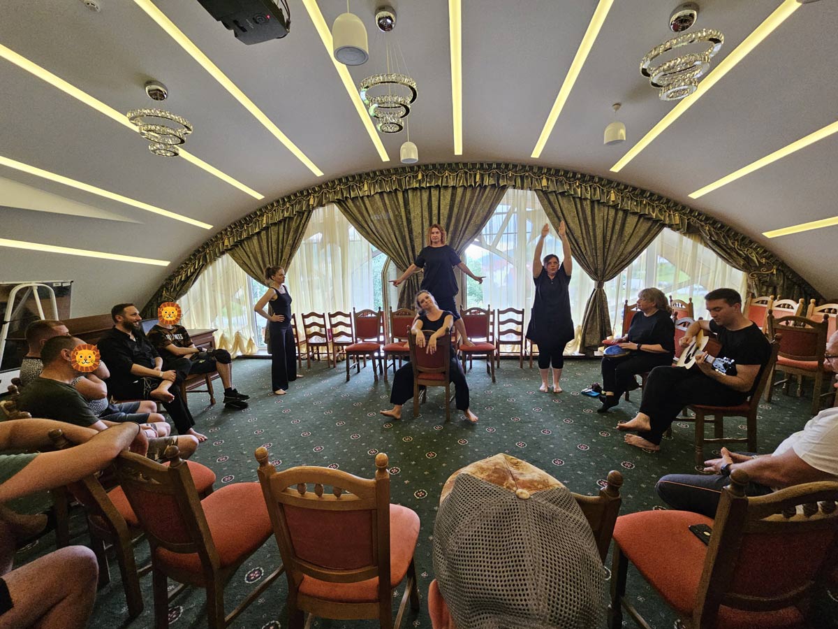 — Одна з причин, чому я мобілізувався пізніше, — це наявність у моєму житті двох спільнот. Я був головою правління Української Школи Плейбек-Театру, 500 осіб по всій країні. Культура нашого театру вибудована так, що всі орієнтувалися на мою роботу і менеджмент. Друга спільнота — проєкт для вчителів «Митці згоди», де ми створили спільноту для працівників державних шкіл, що дуже виснажилися й вигоріли, але мають виховувати майбутнє України. Ми почали навчати вчителів різним арттехнікам, барабанному колу та плейбек-театру. Вийшло створити вчительську спільноту, яка продовжує роботу з підтримки та взаємодії між собою. До прикладу, вчителька з Енергодара під час окупації таємно збирала вчителів своєї школи і використовувала наші техніки. Вони грали, малювали, ліпили й займалися корисними артпрактиками. Кожен раз у новому місці.