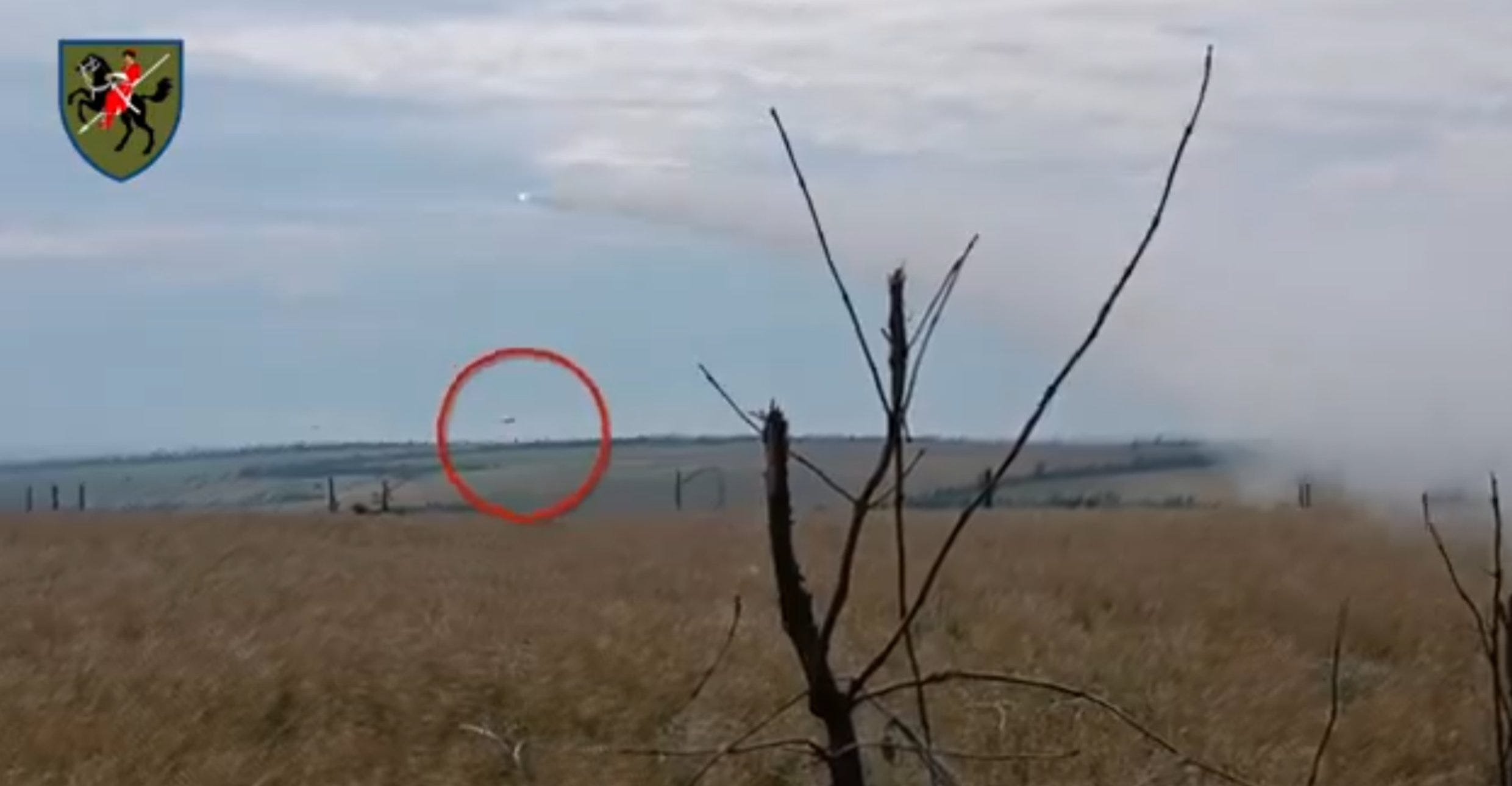 Вид з БПЛА на збитий Су-25 російських воздушно-космічєских сил, 23 липня. Парашут пілота – праворуч, вогняна куля, що утворилася від удару літака об землю, – в центрі. Літак був збитий з французької ППО малої дальності «Mistral». Якщо більшість ПЗРК в Україні мають ефективну дальність 2-4 кілометри, то дальність «Mistral» – 8 кілометрів, тож вони можуть діставати росіян там, де вони цього найменше очікують.