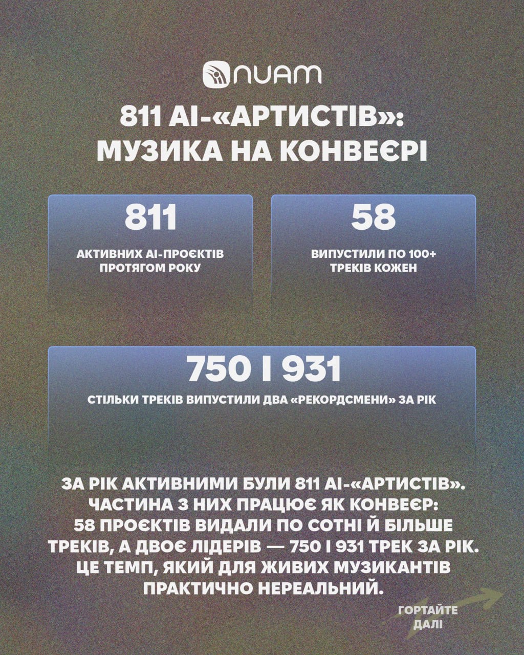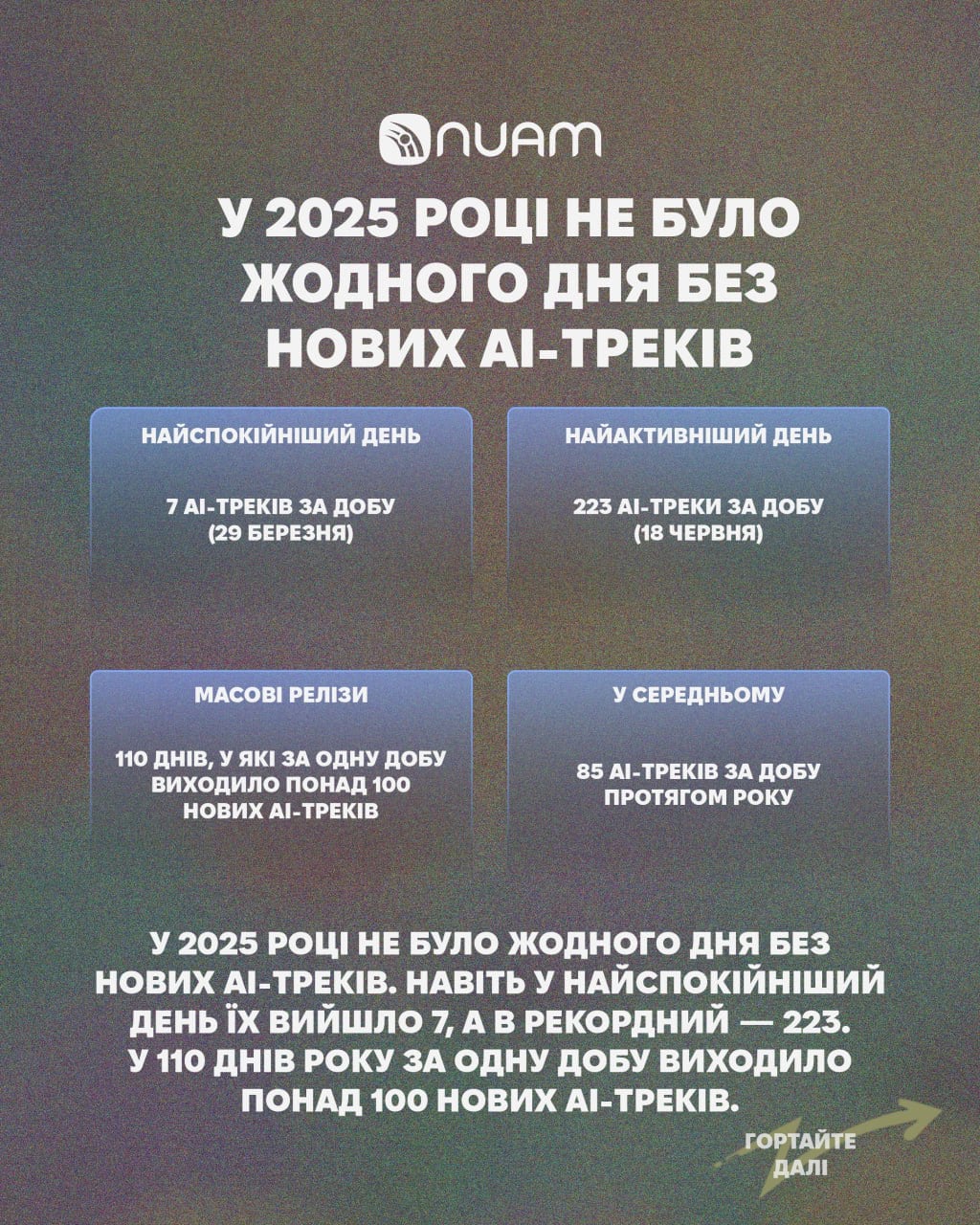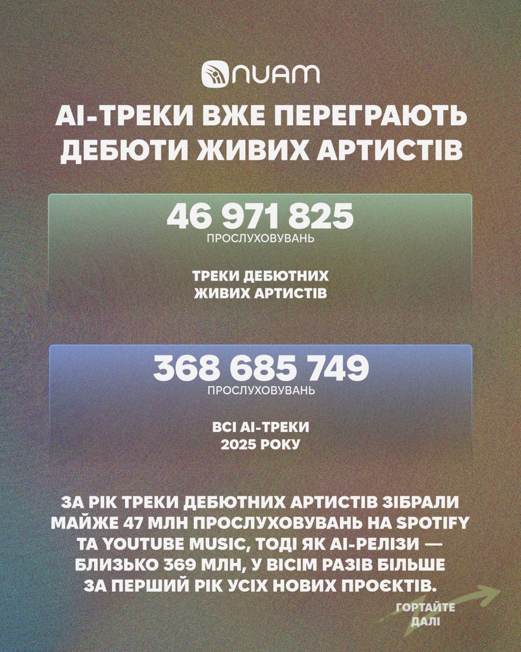 Агрегатор української музики з широкими можливостями з пошуку та дослідженню всіх артистів України та всіх їхніх релізів NUAM 1 грудня виклав дослідження цьогорічної української музики. Згідно з ним, в 2025 році вийшло 77 тисяч треків і 27,5 тисяч із них (35,62%) — це ШІ, тобто кожен третій трек української музики був згенерований штучним інтелектом.