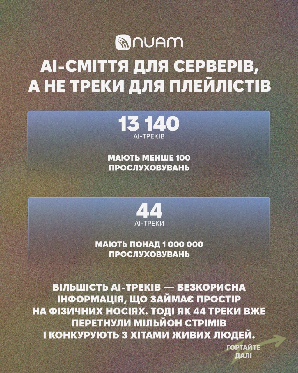 Підсумовуючи, NUAM пише про те, що «масова поява AІ-треків — це закономірний етап технологічного розвитку, який просто дістався музики. Низькоякісні треки штампували й до появи штучного інтелекту — їх було вдосталь і з великих студій, і з домашніх сетапів. Тепер до цього просто доєднався AІ. Обсяг сміття виріс, але принцип не змінився: хорошій музиці завжди доводилося пробиватися крізь море посередності. АІ не є прямою конкуренцією живим артистам. Як і раніше, головне поле боротьби — не кількість релізів, а якість слухання. Тому ключове завдання зараз — піднімати музичний смак української аудиторії. Те, що AІ-треки низької якості стають популярними, — це не доказ сили штучного інтелекту, а сигнал про те, що з музичним смаком ще багато роботи. Якщо спільно піднімати планку, алгоритмам буде значно складніше проштовхувати безликий Іl-потік — бо вгорі стрічки вже стоятиме сильна, жива українська музика».