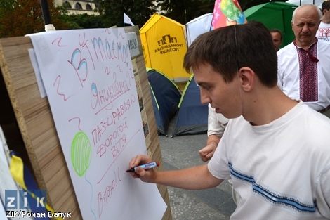 Як повідомлялось, учасники акції на захист української мови, що проходить біля Українського дому у Києві, у подарунок президенту Віктору Януковичу на день народження зібрали валізу та квиток на потяг до Білорусі.