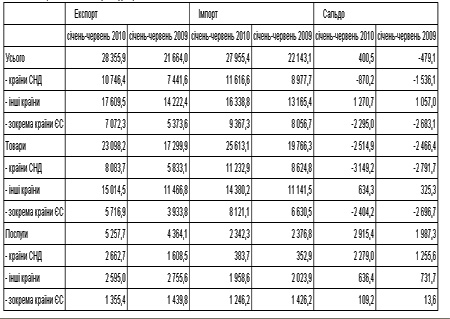 У січні-червні 2010 року сальдо зовнішньої торгівлі товарами і послугами покращилося на 879,6 млн. доларів порівняно з січнем-червнем 2009 року і становило 400,5 млн. доларів.