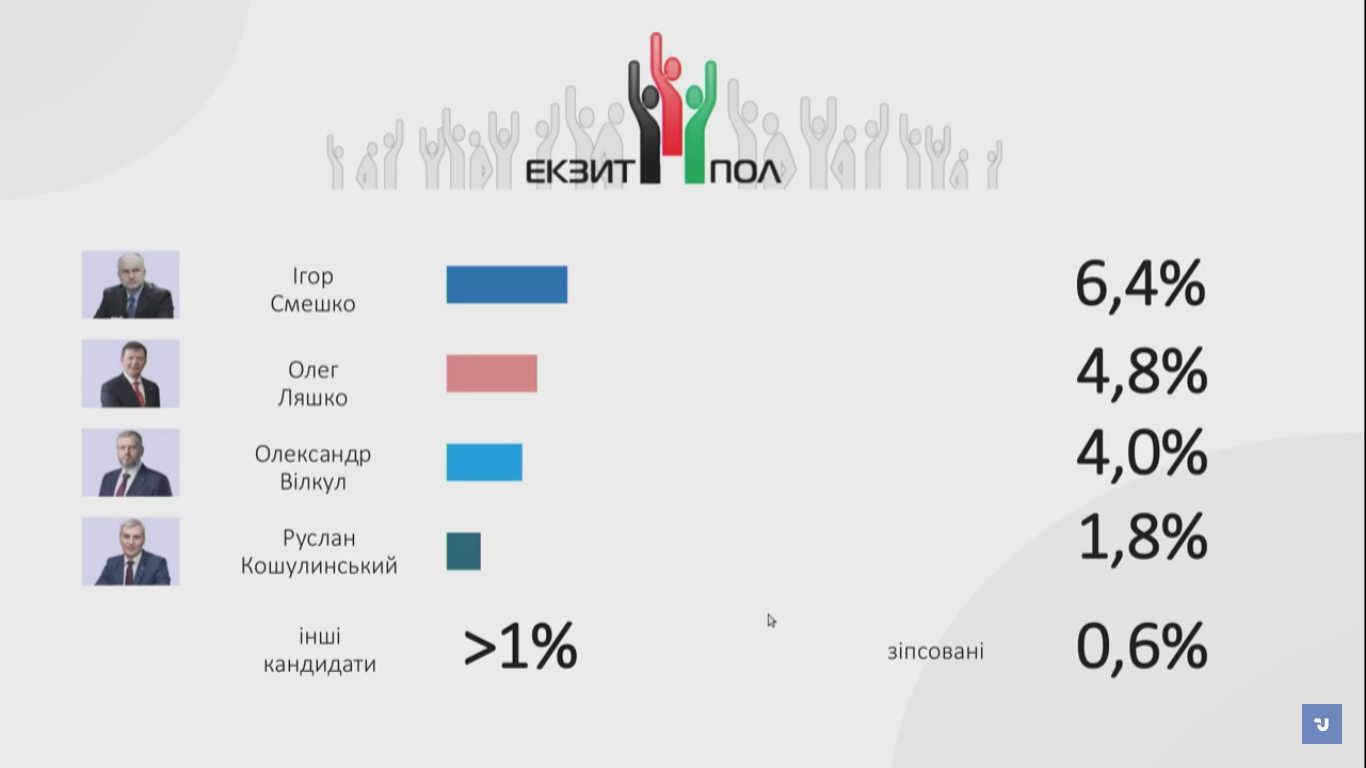 Водночас за даними екзит-полу в Тимошенко – 14,0% голосів, Бойка – 9,1% виборців, Гриценка – 7,6%, Смешка – 6,6% Ляшка – 5%, Вілкула – 3,7%, Кошулинського – 1,9%.