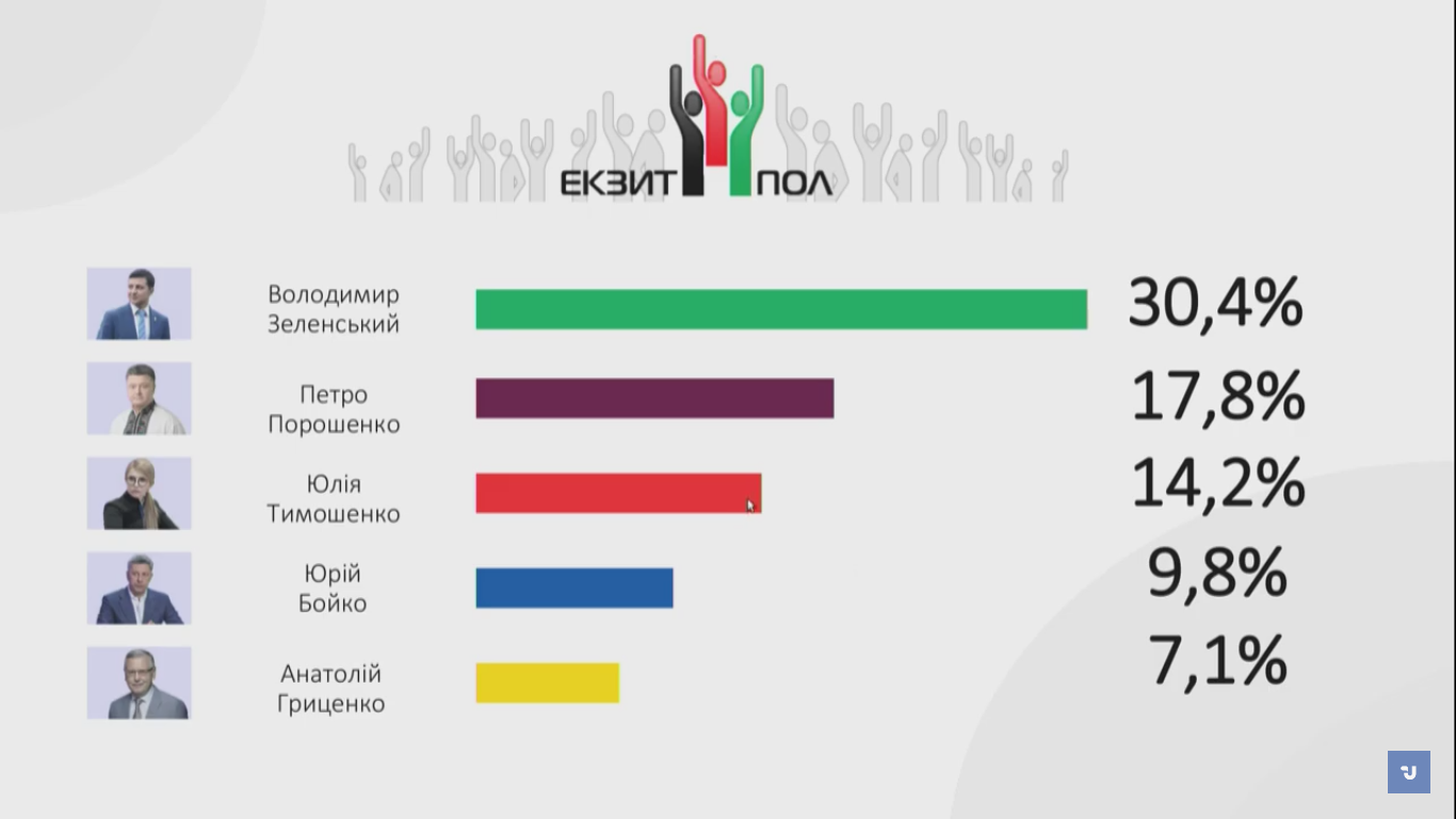 Згідно з даними екзит-полу, проведеного ТСН, до другого туру виборів виходять Зеленський і Порошенко, їх підтримали в першому турі виборів відповідно 30,1% і 18,5% українців.