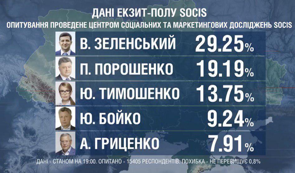 Згідно з даними екзит-полу, проведеного Центром соціальних і маркетингових досліджень SOCIS, до другого туру виборів також виходить Зеленський і Порошенко. За даними центру, їх підтримали в першому турі виборів відповідно 29,25% і 19,19% виборців.