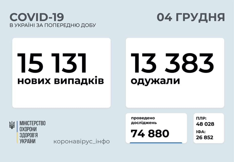 Станом на 4 грудня в Україні зафіксовано 15 131 новий випадок коронавірусної хвороби COVID-19. Про це повідомив міністр охорони здоров'я Максим Степанов у фейсбуку.